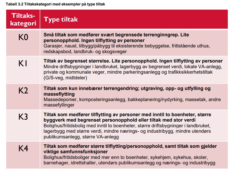 Kort sagt brukes tiltakskategori for å avgjøre hvor omfattende dokumentasjon og vurdering som må ligge til grunn før et tiltak kan gjennomføres i et område med mulig kvikkleirefare.
