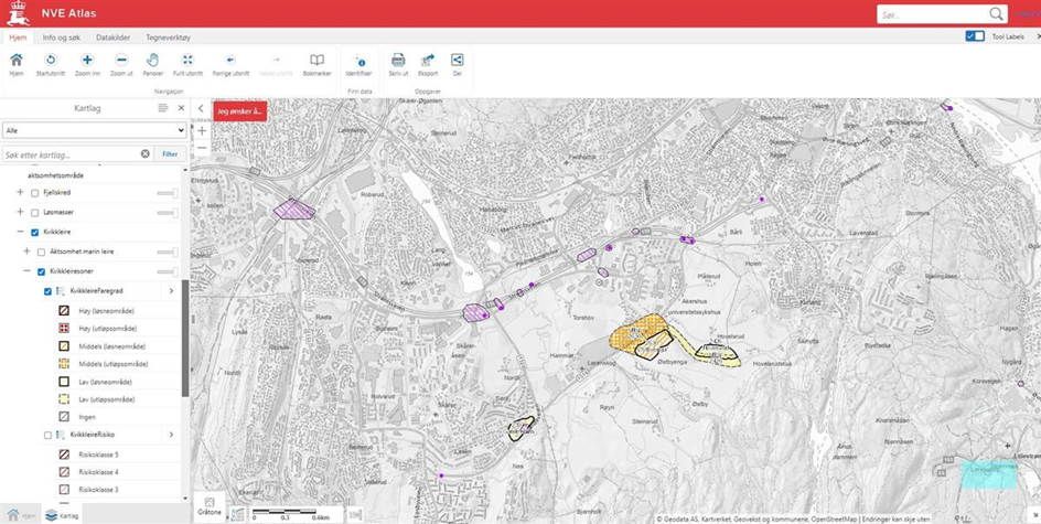 Kvikkleire finnes under marin grense. En rekke områder med kjent kvikkleire i grunnen er registrert i NVEs kvikkleiredatabase. Velg “Kartlag” nede til venstre → “Naturfare” → “Kvikkleire” → “Kvikkleiresoner”. Figuren under er skjermklipp fra kvikkleiredatabasen per november 2023.